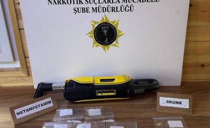 Araçta yapılan aramada narkotik dedektör köpeği 'Pera' ile bagaj kısmında bulunan elektrikli süpürgenin içerisine saklanmış 200 gram sentetik uyuşturucu ile 2 gram esrar ele geçirildi.
