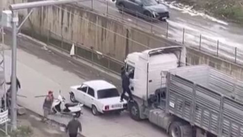 Samsun Atakum Kurupelit'te çıkan tartışma kavgaya dönüşüp, 2 kişi seyir halindeki tır şoförüne sopayla saldırdı; saldırı anı cep telefonu kamerasına yansıdı.