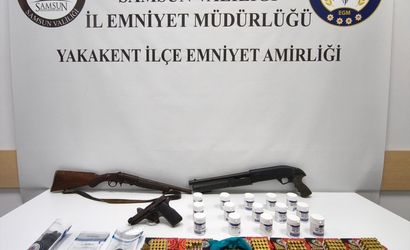 Operasyona destek veren Alaçam İlçe Emniyet Müdürlüğü ekiplerinin, araçtaki 2 şüphelinin ikametlerinde yaptığı aramada ise ruhsatsız tabanca, 240 fişek, 2 ruhsatsız tüfek, 10,6 gram kenevir tohumu ve 3 sentetik ecza hapı bulundu.