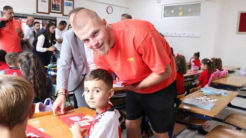 Samsunsporlu futbolcular, 1. sınıfa başlayan öğrencilere defter, kalem ve çam fidanı hediye etti; etkinlik 60. kuruluş yılı kapsamında düzenlendi.
