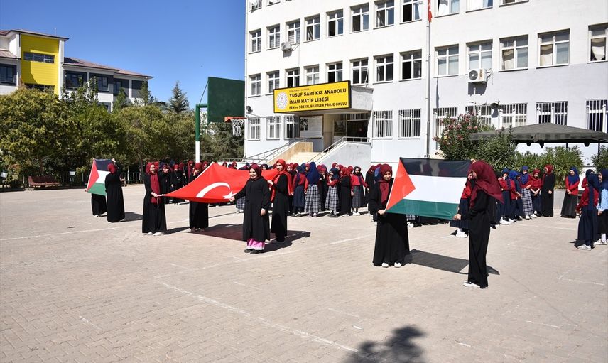 Şanlıurfa'nın Siverek ilçesinde Yusuf Sami Kız Anadolu İmam Hatip Lisesi öğrencileri, İsrail ablukasını kırmak ve insani yardım ulaştırmak amacıyla Gazze'ye giden Küresel Sumud Filosu'na destek vermek için okul bahçesinde toplandı.