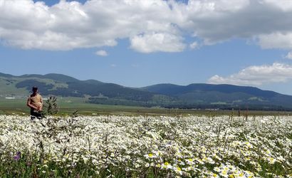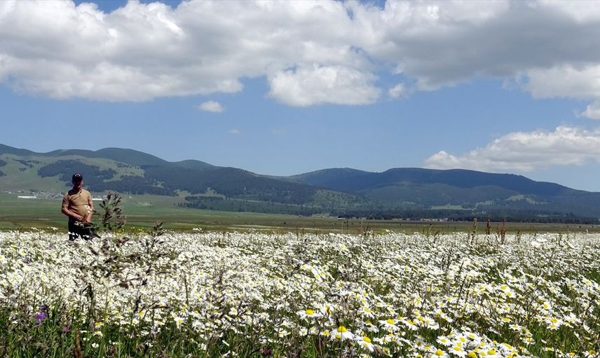 Kış mevsiminin uzun ve çetin geçtiği Kars'ın Sarıkamış ilçesinde mera ve çayırlıklar papatya çiçekleriyle bezendi.