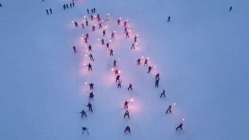 Sarıkamışlı genç kayakçılar, Sarıkamış Kayak Merkezi'nde Bursa'da 27 Mart 2025'te hayatını kaybeden dostlarını meşalelerle anarak vefa gösterdi.