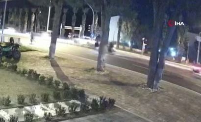 Çevredeki bir iş yerinin güvenlik kamerasına yansıyan görüntülerde, motosikletin yolun karşısına geçmeye çalıştığı sırada otomobilin büyük bir hızla çarptığı, çarpmanın etkisiyle motosiklet ile sürücüsünün adeta ok gibi savrulduğu görülüyor.