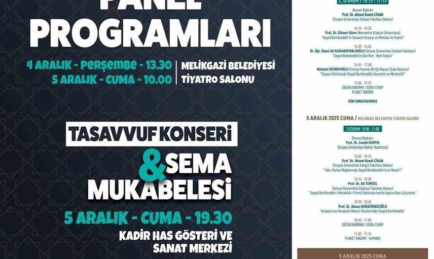 Program kapsamında düzenlenecek Tasavvuf Konseri ve Sema Mukabelesi, 5 Aralık Cuma günü saat 19.30'da Kadir Has Gösteri ve Sanat Merkezi'nde izleyiciyle buluşacak. Konserde Ömer Faruk Güney ve Kasidehan Aziz Hardal sahne alacak ve Kayserililer için özel bir anma sunulacak.