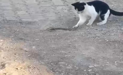 Görüntülerde kedi, bir süre yılanla oyuna devam ettikten sonra patisiyle yılanın kafasına vuruyor. Ardından hayvanı ağızlayıp uzaklaştırdığı görülüyor.