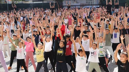 Siirt Şehit Polis Hayrettin Şişman Ortaokulu'nda 1600 öğrenci, obezite ve dijital bağımlılıkla mücadele kapsamında müzik eşliğinde toplu spor etkinliği yaptı.