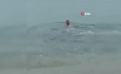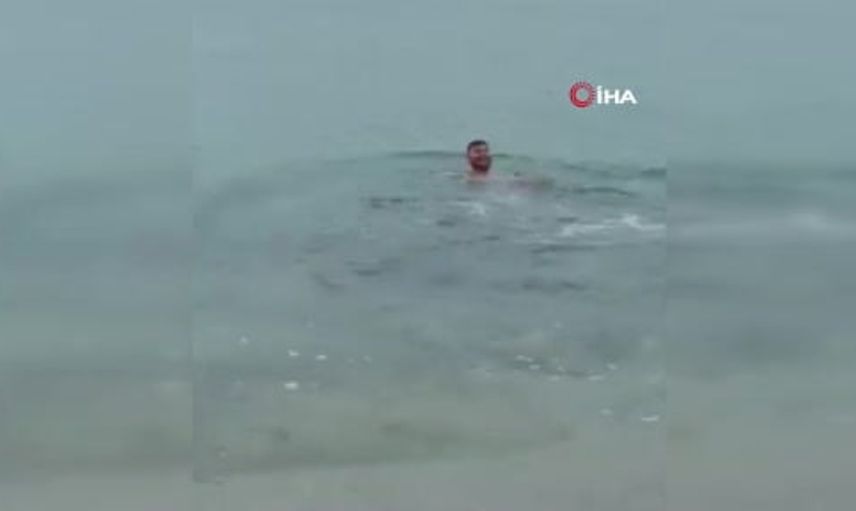 Görüntülerde sahil şeridinde biriken karlar ve Duran'ın soğuk suda yüzdüğü anlar net biçimde görülüyor.