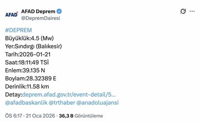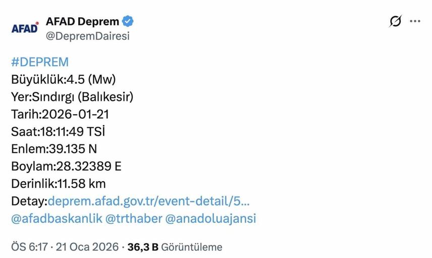 AFAD'dan alınan bilgilere göre saat 18.11'de, merkez üssü Balıkesir’in Sındırgı ilçesi olan 4.5 büyüklüğünde deprem meydana geldi. Yerin yaklaşık 11.58 kilometre derinliğinde gerçekleşen sarsıntı çevre ilçelerle birlikte Bursa ve bölgedeki birçok ilde hissedildi.