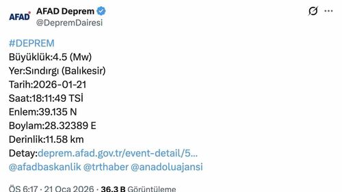 Sındırgı'da saat 18.11'de meydana gelen 4.5 büyüklüğündeki deprem, 11.58 km derinlikte olup Bursa ve Marmara'da hissedildi; ilk belirlemelere göre olumsuz bir durum bildirilmedi.