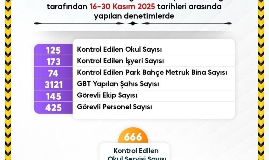 Denetimler 16-30 Kasım 2025 tarihleri arasında gerçekleştirildi. Bu kapsamda 125 okul, 173 iş yeri ve 74 park, bahçe ve metruk bina kontrol edildi. Kimlik sorgulaması kapsamında 3.121 kişi hakkında GBT taraması yapıldı.