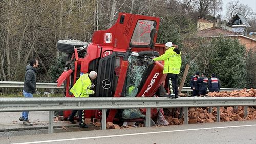 Sinop'un Gerze ilçesinde tuğla yüklü kamyonun devrilmesi sonucu sürücü yaralandı.