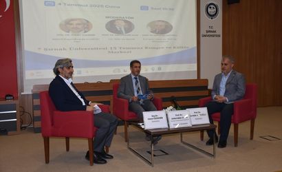 Şırnak Üniversitesi (ŞÜ) El-Cezeri Salonu'nda "Hz. Nuh ve Mesajı" konulu panel düzenlendi. ŞÜ Rektörü Prof. Dr. Abdurrahim Alkış'ın (ortada) moderatörlüğünde yapılan oturumda, ŞÜ İlahiyat Fakültesi Öğretim Üyesi Doç. Dr. Ahmet Özdemir (sağda) ve ŞÜ İlahiyat Fakültesi Öğretim Üyesi Prof. Dr. Nurullah Agitoğlu (solda) sunum yaptı.