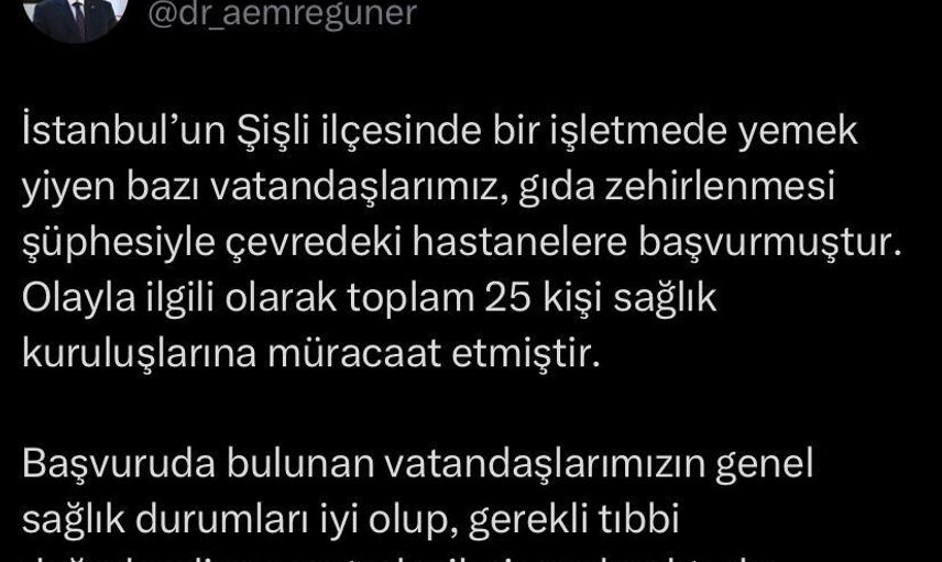 Güner'in yazılı açıklaması şöyle: "İstanbul’un Şişli ilçesinde bir işletmede yemek yiyen bazı vatandaşlarımız, gıda zehirlenmesi şüphesiyle çevredeki hastanelere başvurmuştur. Olayla ilgili olarak toplam 25 kişi sağlık kuruluşlarına müracaat etmiştir. Başvuruda bulunan vatandaşlarımızın genel sağlık durumları iyi olup, gerekli tıbbi değerlendirme ve tedavileri yapılmaktadır"