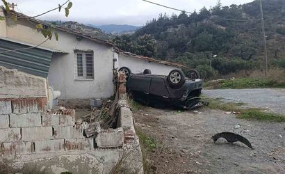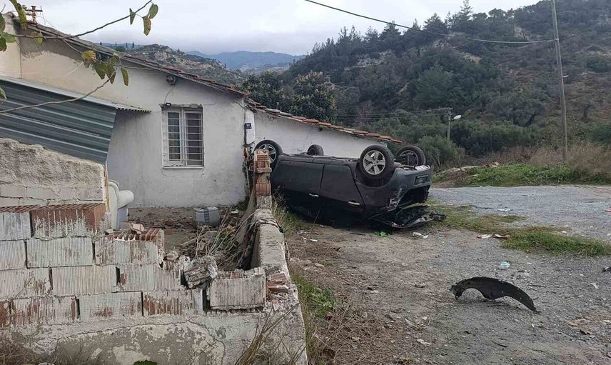 Çarpmanın etkisiyle araç savrularak takla attı ve ters döndü; araç bir evin duvarına çarparak durdu.