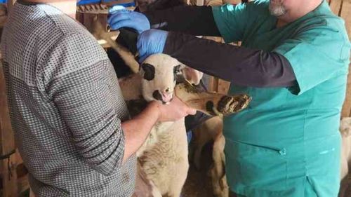 Söke İlçe Tarım ve Orman Müdürlüğü ekipleri Sazlı Mahallesi'ndeki koyunculuk işletmesinde kuzuları küpeleyip veba hastalığına karşı aşı uyguladı.