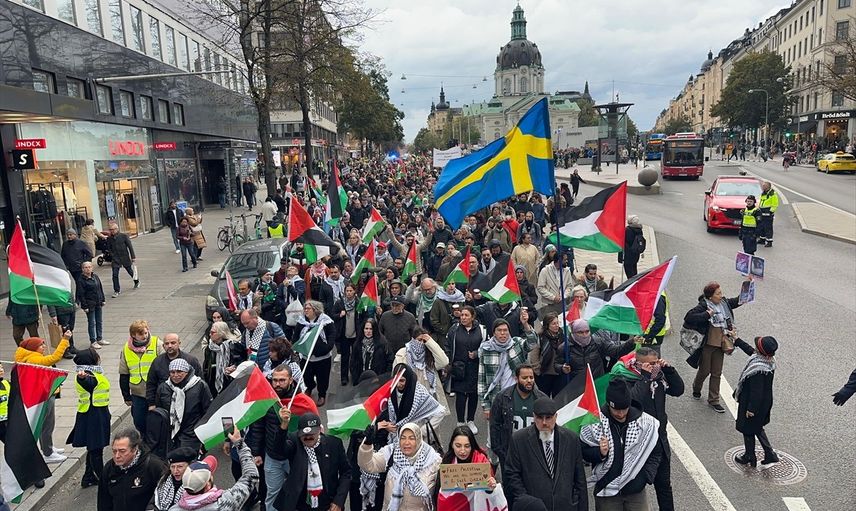 Çok sayıda sivil toplum kuruluşu çağrısıyla Odenplan Meydanı'nda toplanan kalabalık, İsrail ordusunun saldırılarını kınadı ve İsveç hükümetinin tutuklanan İsveçli aktivistler için sessiz kalmasını "ikiyüzlülük" olarak nitelendirdi.