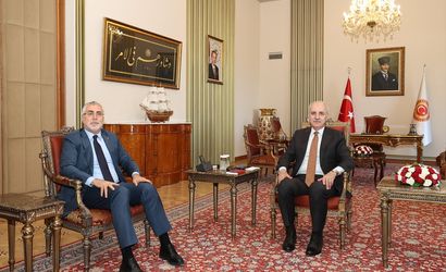 TBMM Başkanı Numan Kurtulmuş (sağda), Çalışma ve Sosyal Güvenlik Bakanı Vedat Işıkhan'ı (solda) kabul etti.