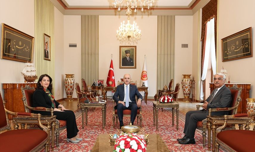 TBMM Başkanı Numan Kurtulmuş (ortada), DEM Parti'li Pervin Buldan (solda) ve Mithat Sancar'ı (sağda) kabul etti.