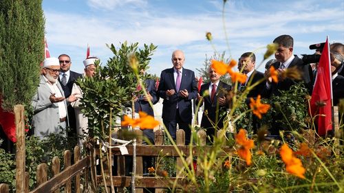 TBMM Başkanı Numan Kurtulmuş, 6 Şubat 2023 Kahramanmaraş merkezli depremlerde hayatını kaybedenler için Adıyaman Deprem Şehitleri Mezarlığı'nda dua etti ve karanfil bıraktı.