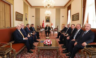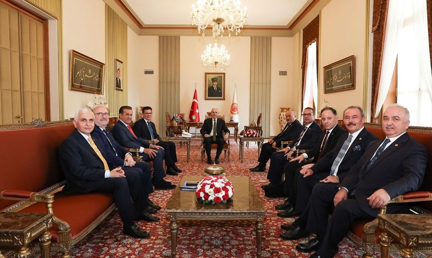 TBMM İliç Maden Kazasını Araştırma Komisyonu Başkanı ve AK Parti Antalya Milletvekili Atay Uslu (sol 4) ile komisyon üyesi milletvekilleri hazırladıkları raporu TBMM Başkanı Numan Kurtulmuş'a (sol 5) takdim etti.