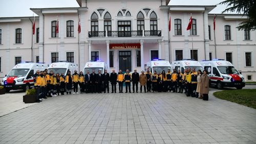 Sağlık Bakanlığı tarafından Tekirdağ'a tahsis edilen 6 yeni ambulans törenle hizmete girdi; Vali Recep Soytürk ve İl Sağlık Müdürü Uzm. Dr. Lütfi Çağatay Onar törene katıldı.