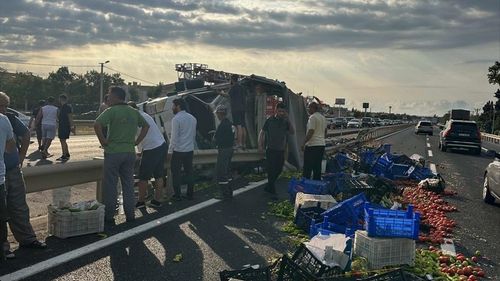Tekirdağ'da devrilen sebze yüklü kamyonun sürücüsü hayatını kaybetti, 2 kişi yaralandı.