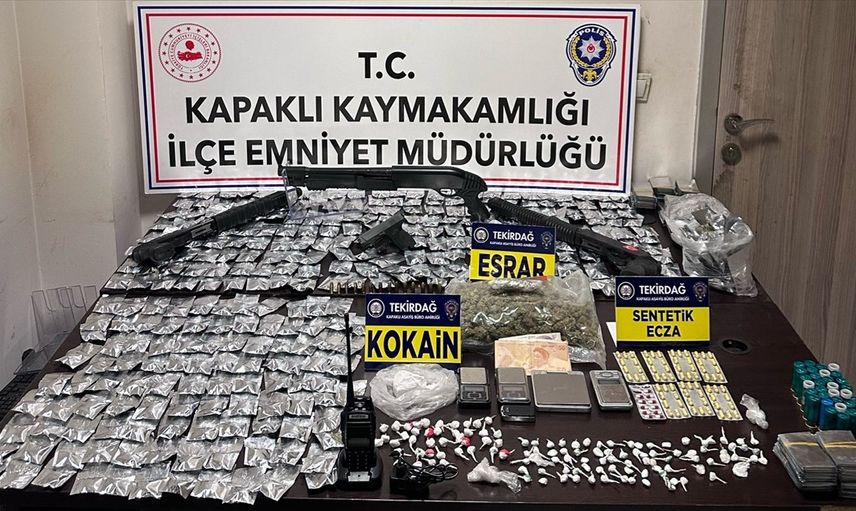 Tekirdağ'da uyuşturucu operasyonunda gözaltına alınan 4 zanlıdan 2'si tutuklandı. Ekipler, belirlenen şüphelilerin ev ve araçlarında yaptıkları aramalarda, 1 kilogram 363 gram sentetik uyuşturucu, 153 gram kokain, 81 uyuşturucu hap, ruhsatsız tabanca, 34 tabanca fişeği, 3 av tüfeği, 5 hassas terazi ve şarj aletiyle birlikte el telsizi ele geçirdi.