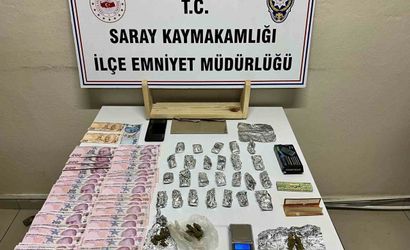 Saray İlçe Emniyet Müdürlüğü Asayiş Bürosu ekipleri tarafından Büyükyoncalı Mahallesi'ndeki ikamette yapılan aramada, satışa hazır 27 adet alüminyum folyoya sarılı toplam 73,2 gram marihuana, satışa hazır 1 poşet içerisinde 5 gram marihuana, 1 hassas terazi, 2 paket sarma kağıdı, 8 bin Türk Lirası nakit para ve 1 adet cep telefonu ele geçirildi.