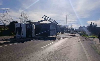 TEKİRDAĞ'IN MURATLI İLÇESİNDE KARAYOLUNDA SEYİR HALİNDEKİ KAMYONUN AÇILAN DAMPERİ, KAMERA VE AYDINLATMA DİREKLERİNİ YIKTI. KAZADA KAMYON DA DEVRİLDİ.
