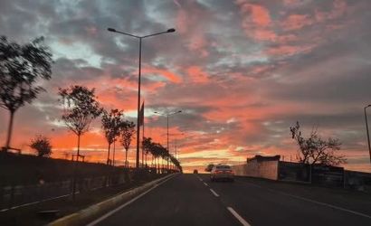 Sabahın erken saatlerinde işe gitmek için yollara düşen vatandaşlar, Marmara Denizi üzerinden yükselen güneşin bulutları turuncuya boyadığı manzarayla karşılaştı. Gökyüzünde adeta renklerin dansı yaşanırken ortaya kartpostallık görüntüler çıktı.