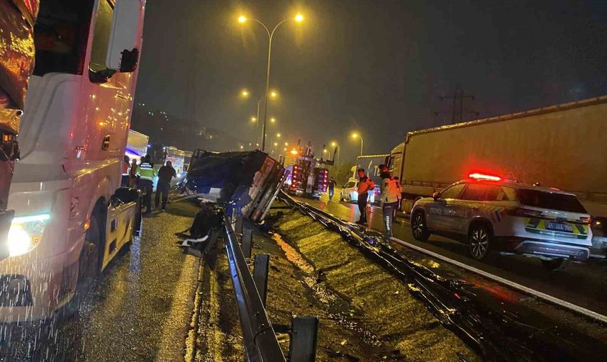 TEM Otoyolu'nda tır devrildi: Granül yola saçıldı, 1 yaralı