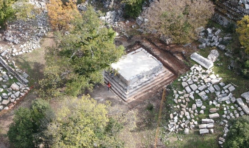Kazı sezonunun bir diğer önemli çalışması, çevresine dağılmış yüzlerce mimari blok arasında yer alan anıt mezar podyumunun ayağa kaldırılması oldu. Koçak, yapının sahibinin yazıtlardan bilindiğini belirterek, "Bu mezar Antiochis adında bir kadın tarafından kendisi, eşi ve eşinin kardeşi için yaptırılmış. Podyumun dört yanında silah kabartmaları yer alıyor. Kalkanlar, mızraklar, oklar, yaylar, zırhlar. Bir aslan kabartması, bir yunus ve gemi pruvası da bulunuyor." ifadelerini kullandı. Mezar, Termessos’ta silah kabartmalı mezarlar arasında en kapsamlı örneklerden biri olarak nitelendiriliyor.