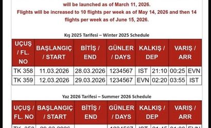 Türk Hava Yolları, İstanbul-Erivan hattındaki seferlerine 11 Mart 2026 tarihi itibarıyla haftada 7 frekans olarak başlayacağını duyurdu.