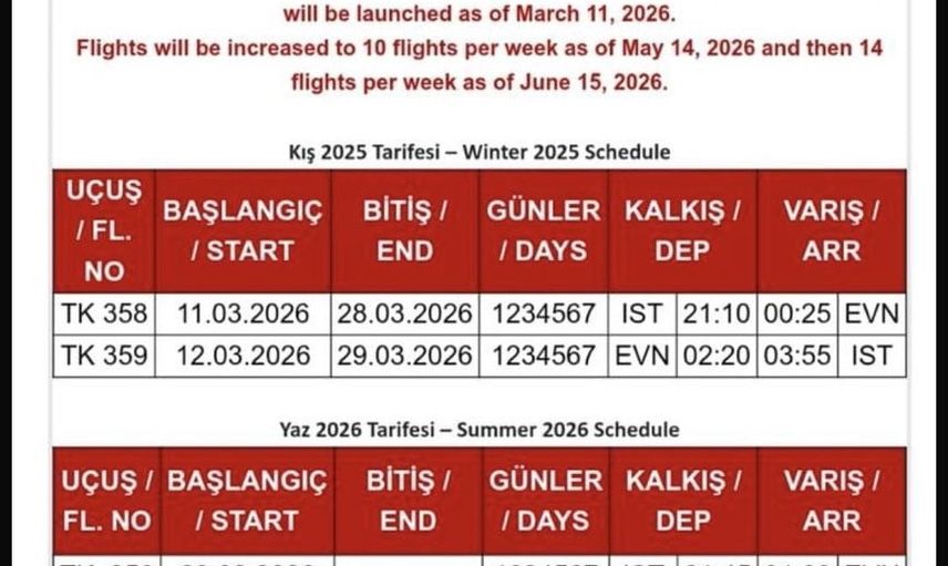 Havayolu şirketinin planlamasına göre, yolcu talebindeki artış doğrultusunda hat üzerindeki kapasite . Kış tarifesinde İstanbul-Erivan seferinin TK358, Erivan-İstanbul seferinin ise TK359 sefer sayısı ile icra edileceği bildirildi. Yaz tarifesinde ise Mayıs 2026 itibarıyla TK360 (İstanbul-Erivan) ve TK361 (Erivan-İstanbul) seferlerinin de hattına ekleneceği kaydedildi. Normalleşme sürecine ilişkin sosyal medya açıklamasında bulunan Türkiye-Ermenistan Normalleşme Süreci Özel Temsilcisi Serdar Kılıç şunları ifade etti: "Yeni bir adım daha. Bu defa da bayrak taşıyıcımız THY 11 Mart 2026 tarihinden itibaren her gün olacak şekilde İstanbul-Erivan-İstanbul seferlerine başlıyor." Planlanan frekans artışına göre, 14 Mayıs 2026 tarihinden itibaren İstanbul-Erivan seferlerinin haftalık frekansı 10'a yükseltilecek. Yaz sezonunun ilerleyen döneminde frekans artışı devam edecek ve 15 Haziran 2026 itibarıyla seferler haftada 14 frekans olarak icra edilecek. THY'nin bu kararı, iki ülke arasındaki ulaşım bağlantısının güçlendirilmesi ve artan yolcu talebine hızlı yanıt verilmesi hedefleri çerçevesinde değerlendiriliyor. TÜRK HAVA YOLLARI, İSTANBUL-ERİVAN HATTINDAKİ SEFERLERİNE 11 MART 2026 TARİHİ İTİBARIYLA HAFTADA 7 FREKANS OLARAK BAŞLAYACAK
