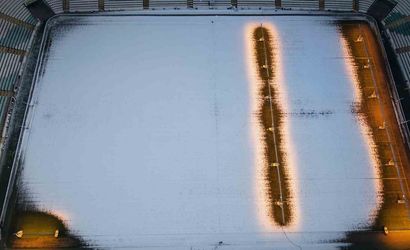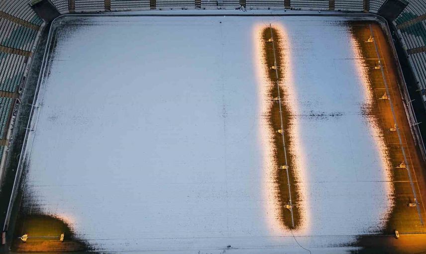 Sahanın beyaza dönüşen zemini, yeşille beyazın buluşmasıyla kartpostallık görüntüler oluşturdu. Sahanın içerisine yağan karın bir kısmının, çimlerin bakımı için açılan güneş panelleri nedeniyle erimesi dikkat çekti.
