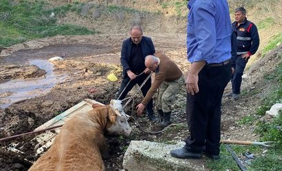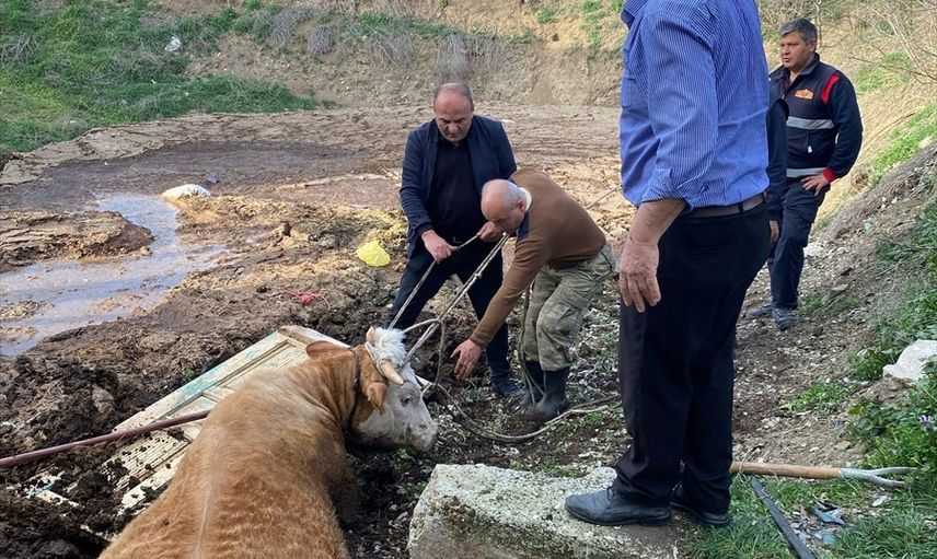 Tokat'tın Zile ilçesinde gübreliğe düşen boğa itfaiye ekiplerince kurtarıldı.