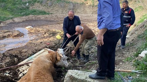 Tokat'ın Zile ilçesinde gübreliğe düşen bir boğa, itfaiye ekiplerinin çabalarıyla kurtarıldı.