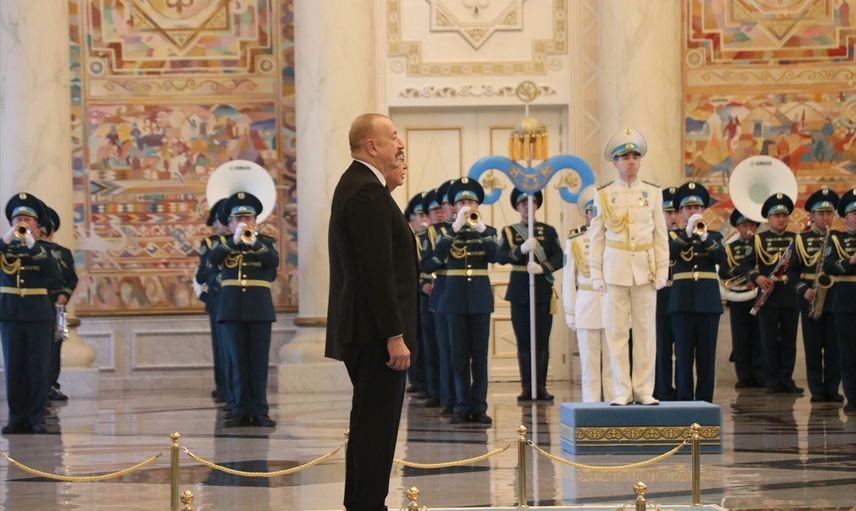 Aliyev, Kazakistan Cumhurbaşkanlığı Sarayı Akorda’da mevkidaşı Kazakistan Cumhurbaşkanı Kasım Cömert Tokayev tarafından ağırlandı.