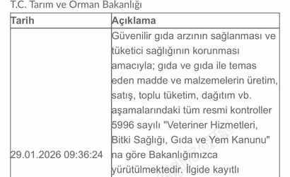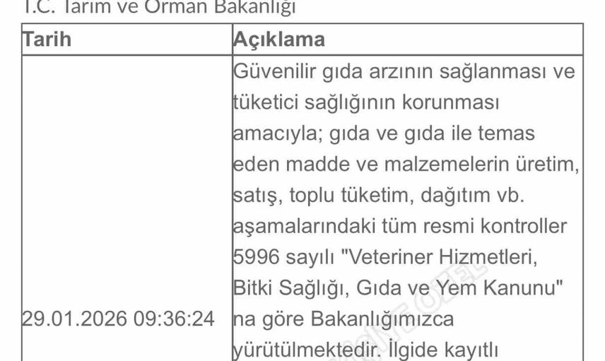 Bakanlık tarafından Fatih Çolak'a yapılan yazılı geri dönüşte, gıda güvenliğine ilişkin denetimlerin 5996 sayılı Veteriner Hizmetleri, Bitki Sağlığı, Gıda ve Yem Kanunu kapsamında yürütüldüğü belirtilerek şu ifadelere yer verildi: