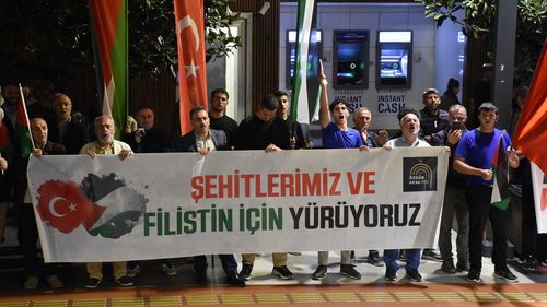Özgür Aksa Trabzon Platformu üyeleri İskenderpaşa Camisi önünden Ziraat Bankası önüne yürüyerek Gazze'ye yönelik saldırıları protesto etti.