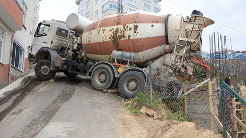 Trabzon'da Yokuştan Kayarak Asılı Kalan Beton Mikseri