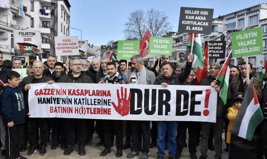 Trabzon'da, İskenderpaşa Camisi önünde toplanan Özgür Aksa Trabzon Platformu üyeleri, Türk ve Filistin bayraklarıyla Kahramanmaraş Caddesi'ndeki Ziraat Bankası önüne yürüyüş gerçekleştirdi. Katılımcılar, Filistin'e destek sloganları attı.