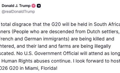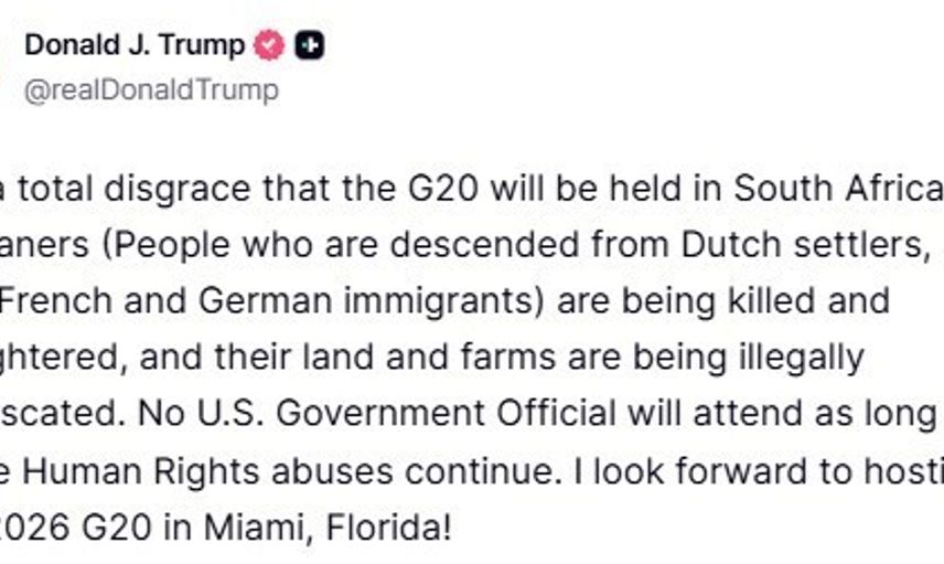 Trump, kendisine ait Truth sosyal medya platformundan yaptığı paylaşımda zirvenin Güney Afrika'da yapılacak olmasını "tam bir rezalet" olarak nitelendirdi.