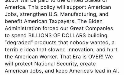 Trump, Joe Biden yönetimini eleştirerek, büyük ABD şirketlerinin düşük kaliteli üretime zorlandığını savundu: "Bu, inovasyonu yavaşlatan ve Amerikalı işçilere zarar veren berbat bir fikirdi. O dönem bitti" dedi.