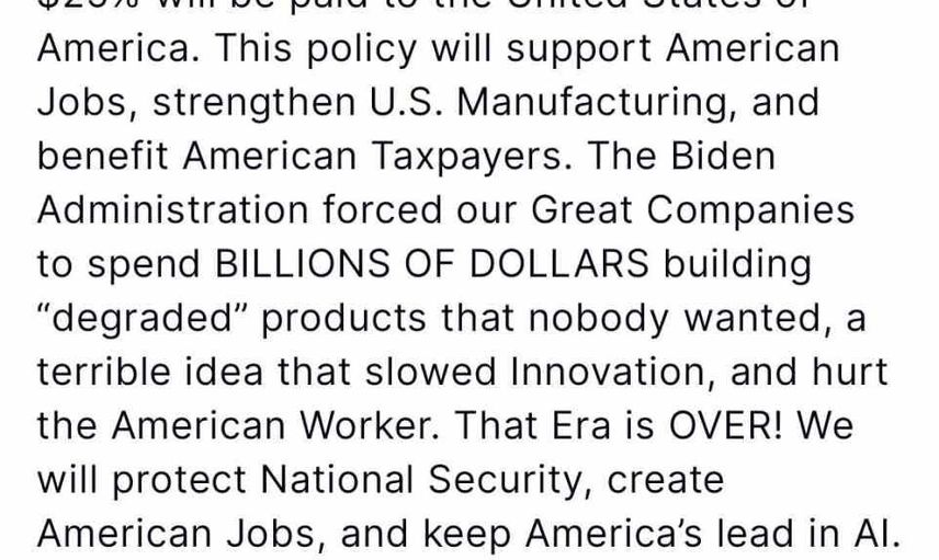 Trump, ayrıca Ticaret Bakanlığı'nın detayları netleştirdiğini ve aynı yaklaşımın AMD, Intel ve diğer büyük Amerikan şirketleri için de geçerli olacağını belirtti.