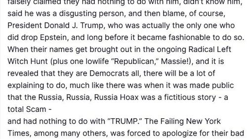 Trump, Epstein belgelerini 'radikal solun cadı avı' olarak nitelendirip Demokratlara ve medyaya uyarıda bulundu; bazı isimlerin itibarının zedeleneceğini söyledi.