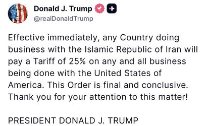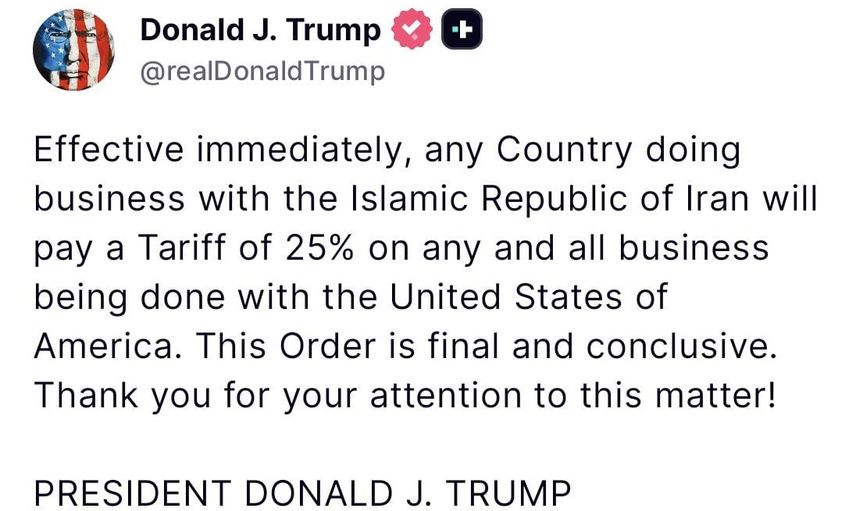 Açıklamada, "Derhal yürürlüğe girmek üzere, İran İslam Cumhuriyeti ile iş yapan herhangi bir ülke, ABD ile gerçekleştirdiği her türlü ticari faaliyette yüzde 25 gümrük vergisi ödemekle yükümlü olacaktır" ifadelerine yer verildi.