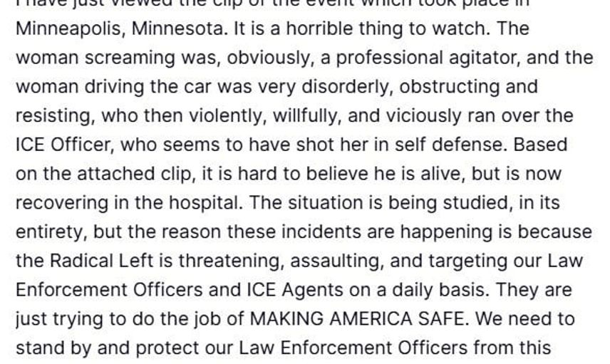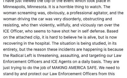 Sahibi olduğu Truth sosyal medya platformu üzerinden paylaşım yapan Trump, olayın videosunu izlediğini belirterek yaşananları "Çok korkunç" olarak niteledi. Görüntülerde bağırdığı duyulan kadını "profesyonel bir provokatör" olarak tanımlayan Trump, aracı süren kadının görevlilere itaatsizlik ederek düzeni bozduğunu, ardından aracını hızlı, kasıtlı ve acımasızca ICE memurunun üzerine sürdüğünü savundu. Trump, görevlinin kendini savunmak için ateş etmiş gibi göründüğünü ifade etti.