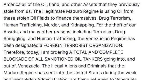 Trump, Venezuela rejimini 'Yabancı Terör Örgütü' ilan etti ve tüm yaptırıma tabi petrol tankerlerine tam ve kapsamlı abluka emri verdi.